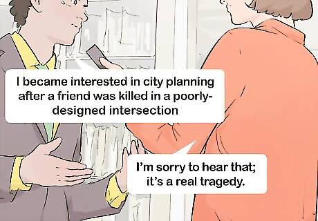 Display sensitivity and sympathy with the interviewee’s answers. During the course of an interview, sensitive or serious topics may arise, or the subject may say things that are meaningful to them. In these instances, show sensitivity and sympathy in your facial expression and body language. Smile and nod to show your interest in what the interviewee says, or shake your head and frown if they bring up an unpleasant statistic. For example, say that the interviewee says, “I became interested in city planning after a friend was killed in a poorly-designed intersection.” It would be inappropriate to say, “So what?” or “That sucks.” Instead, say something like, “I’m sorry to hear that; it’s a real tragedy.”