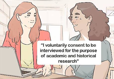 Obtain verbal or written permission to conduct the interview. It's crucial that you get each subject’s verbal consent to being recorded before you begin the interview. Without this consent, the interviewee could allege that you recorded them illegally. Turn on the recorder or video camera, and ask the interviewee to say something like, "I voluntarily consent to be interviewed for the purpose of academic and historical research." If you'd rather not ask immediately before the interview, ask the interviewee to fill out a consent form a week before the interview takes place. If the subject refuses to give their consent, you'll be unable to legally do the interview. For a sample consent form, look online at: https://managementhelp.org/businessresearch/consent-form.htm.