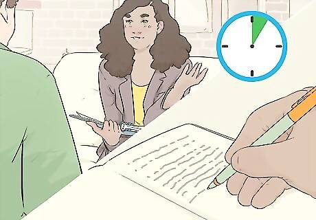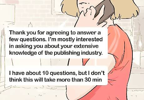 Explain the purpose of the interview at least a week beforehand. Clarifying the interview’s purpose to the interviewee will help the person you’re interviewing know what they can expect from the course of the interview and will allow them to feel at ease. Mention roughly how many questions you have, what some of them will address, and approximately how long you think the interview will take. If you set up the interview over the phone or via email, say something like, “Thank you for agreeing to answer a few questions. I’m mostly interested in asking you about your extensive knowledge of the publishing industry. I have about 10 questions, but I don’t think this will take more than 30 minutes.”