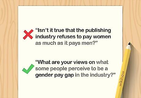 Structure your questions objectively and without bias. If the questions that you’re asking become too subjective, or if you try to lead the interviewee to give a specific answer, the interview will lose some of its objectivity. Regardless of any personal feelings on the subject of your question, word your question so that the interviewee can express their personal stance without feeling lead or antagonized. For example, avoid a question like, “Isn’t it true that the publishing industry refuses to pay women as much as it pays men?” Try asking instead: “What are your views on what some people perceive to be a gender pay gap in the industry?”
