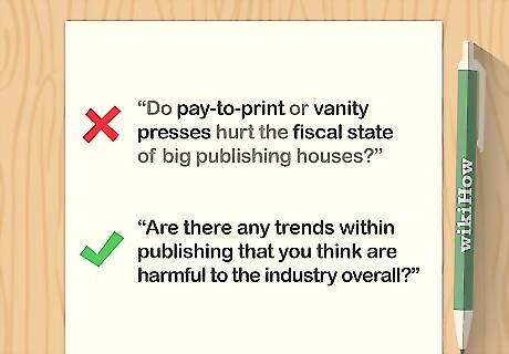 Ask questions that are clear, generous, and jargon-free. Unless you’re planning to conduct a very aggressive interview (which isn’t recommended), start out with questions that are broad in scope, and get more specific as the interview progresses. Avoid using industry-specific jargon (especially if the interviewee isn’t familiar with the terms). Finally, word your questions as clearly as possible to avoid miscommunicating. For example, avoid asking, “Do pay-to-print or vanity presses hurt the fiscal state of big publishing houses?” Instead, ask something like, “Are there any trends within publishing that you think are harmful to the industry overall?”