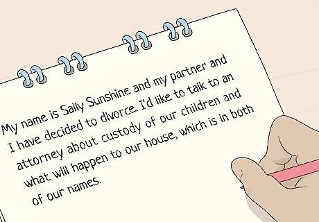 Write down what you're going to say before you call. You don't want to be stammering when you introduce yourself to an attorney, so make yourself a basic script before you pick up the phone to call their office for the first time. Tell them your full name and a basic description of your legal issue and what you want to accomplish. For example, if you're calling an attorney about a divorce, you might write down, "My name is Sally Sunshine and my partner and I have decided to divorce. I'd like to talk to an attorney about custody of our children and what will happen to our house, which is in both of our names." If you're calling an attorney because you've already received court papers, on the other hand, you want to be more specific. For example, you might write down, "My name is Peter Pepper and today I was served with a summons regarding a credit card that went into collections. The date on the summons is February 14. I believe this lawsuit was filed in error and I would like to get it dismissed."Tip: If you've been served with court papers, let the attorney know any deadlines from the outset. This may determine whether or not they're able to take your case.