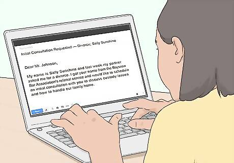 Send an email if you're uncomfortable talking on the phone. If you get nervous or anxious talking on the phone, get the attorney's email address from their website and send them an email instead. Use a descriptive subject line, such as "Initial Consultation Requested" followed by your name and the subject of your case. For example, your subject line might be "Initial Consultation Requested — Divorce; Sally Sunshine." State upfront that you aren't comfortable talking on the phone. The attorney should be willing to work with you on that. If they're not, they're probably not the attorney you want to hire. Introduce yourself, including your first and last name, and then provide a brief description of your case. For example, if you are getting a divorce, you might write, "My name is Sally Sunshine and last week my partner asked me for a divorce. I got your name from the Bayview Bar Association's referral service and would like to schedule an initial consultation with you to discuss custody issues and how to handle our family home." Give the attorney your contact information as well as some information about your availability. For example, you might let them know that you are only available in the afternoon. Close your email by thanking the attorney for their time and attention.