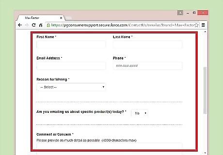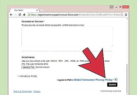 Submit your email. Upon finishing the form, you will have to check a box that says that you agree the P&G’s Global Consumer Privacy Policy. Be sure to read this section thoroughly before pressing send on your email. If you don’t hear back from Max Factor within 2 to 3 days after contacting them, Max Factor asks that you follow up with a phone call.