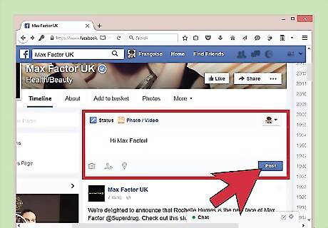 Send Max Factor a message. Compose your message to Max Factor by writing on their Facebook wall. Writing on Max Factor’s wall will make your post open to the public. When you are finished posting your message to Max Factor, click “Post”.