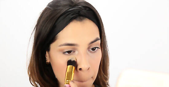 Buffer in the foundation. If your foundation looks caked on, the contour lines you apply on top of it will suffer. When applying your foundation, make sure it gets buffered on smoothly. Use the right tools for the product you're applying, and always use circular motions to apply foundation. Unless you're very skilled at makeup, go for a buffing brush over a flat brush for most foundations. All you need to do is buffer the foundation into your skin, swirling the brush in circular motions. If you don't have brushes, you can use your fingers to apply foundation. However, this tends to work best with cream products. Dab a dot of foundation on your forehead, cheeks, and chin. Swirl the foundation into your face using your middle and ring finger.