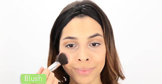 Add a line of blush above your contour lines. Use a wider, fluffier brush to apply your blush. Make sure to add the blush above, not below, the contour line you just drew. You will start your blush line slightly below your contour line, on the apples of your cheek. Move your line upward, following the contour line. Make sure not to cross the contour line as you follow it.