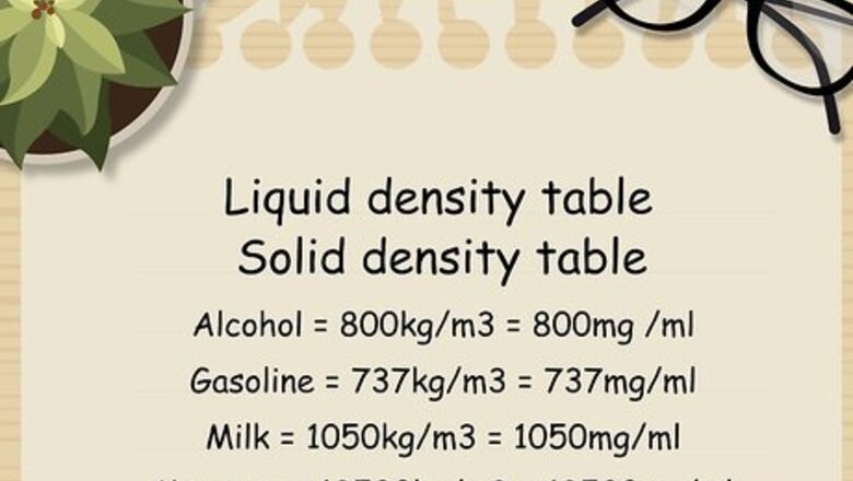 Find the density of the material you are measuring. Because you are trying to convert mass into volume, you need to know the density of the material. Density is a measurement of how much mass fits in a given volume for any substance. Materials that we consider "heavy" have a high density, while "light" materials have a low density. Density tables exist online or in many text books for a wide range of substances. You can find a table of density values by searching for “density table,” “liquid density table,” or “solid density table.” The density of pure water is set at 1000 kg per cubic meter. This is the same as 1000 mg/ml. For comparison, some other common liquids have the following densities: Alcohol = 800 kg/m=800 mg/ml Gasoline = 737 kg/m=737 mg/ml Milk = 1050 kg/m=1050 mg/ml Mercury = 13590 kg/m=13590 mg/ml