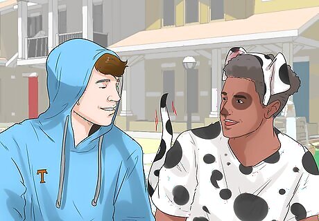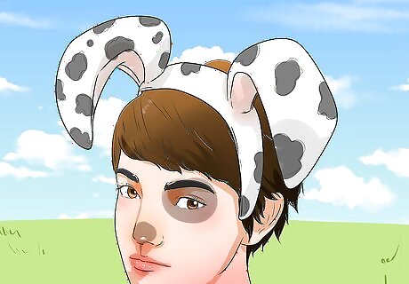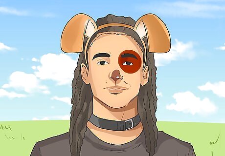 Get some dog ears. A popular option for getting an animal look is a Spirit Hood. These are large, furry hats with long sides which drape down and end in mittens with paws prints on the underside. This is a great start to a dog costume. You can also find dog ears on a headband or make your own by gluing felt to a headband. If your hair is long enough to put in pig tails, you can make ears out of your own hair.