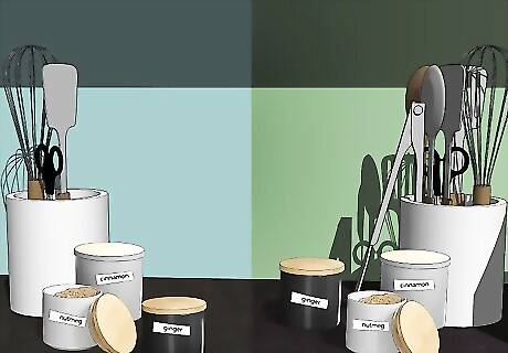 Divide ingredients if necessary. That is, if you use certain items in both baking and cooking, consider having them in both areas. That holds true for ingredients like cinnamon, nutmeg, and ginger, but it's also true for items like stirring spoons and whisks.
