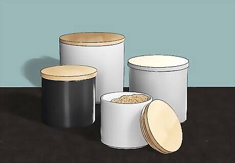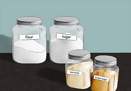 Get canisters to organize your common ingredients. You've probably seen a line-up of canisters to hold common ingredients. You don't have to get a pretty matching set, but having a canister for each ingredient is important. You'll need one for flour, one for each type of sugar you use, and smaller containers for things like spices, salt, baking soda, and baking powder. Make sure each container is labeled so you don't have to open it to figure out what it is.