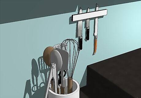 Add utensils. If you're creating a baking area, you want to have utensils that are dedicated to baking that stay in this area. That way, you're not wasting time digging them out every time you want to bake. You'll need things like spoons for stirring, spatulas for removing cookies, and rolling pins for rolling out dough. Don't forget a few sharp knives, too, as well as extras like cookie and biscuit cutters.