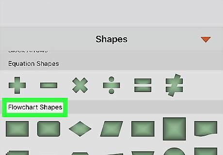 Scroll down to the Flowchart Shapes section. This section on the Shapes menu lists all the different shapes used in flowcharts.
