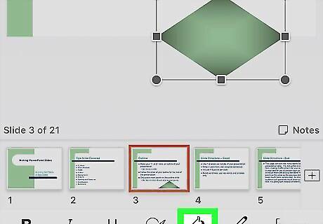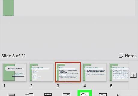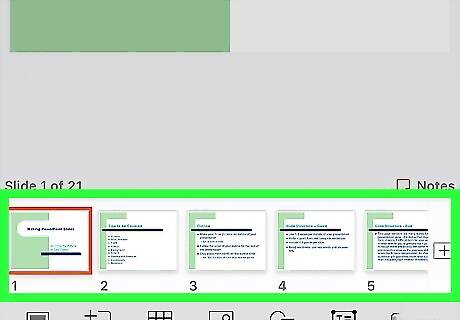 Tap the slide you want to edit at the bottom. You'll find a list of all the slides in your presentation at the bottom of your screen. Tap the slide you want to edit here Alternatively, you can add a new slide by tapping the "+" icon on the bottom-right.