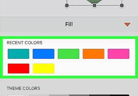 Tap the paint bucket icon on the bottom-toolbar. This button will allow you to change the fill color of your shape, and create a customized look for your flowchart. This step is optional. If you're short on time or prefer the default color, you can just leave it as it is. You can also customize the color of your shape's border outlines. To do this, tap the pencil icon next to the paint bucket on the toolbar.