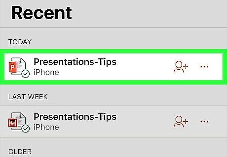 Tap the slideshow file you want to edit. Find and tap the presentation you want to edit on your Recent files list. If you don't see the file you want to edit on the Recent list, tap Open on the bottom-right corner to view all your files. You can also tap New on the bottom-left to start a new presentation.