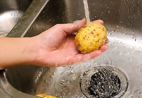 Wash the potatoes. Make sure they are clean and any other bits which stick out have been peeled. Though, leave the skin on if you can!