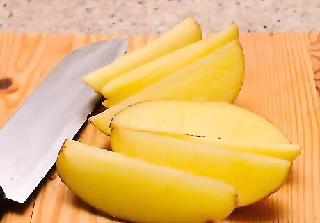 Cut them. Cut the potatoes in half, half again, and half again! Cut all potatoes into eighths. If your potato is small, then cut less, if it is big, then cut some more pieces.