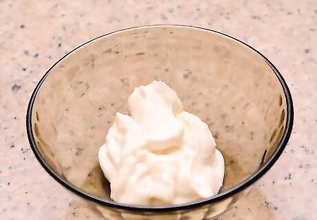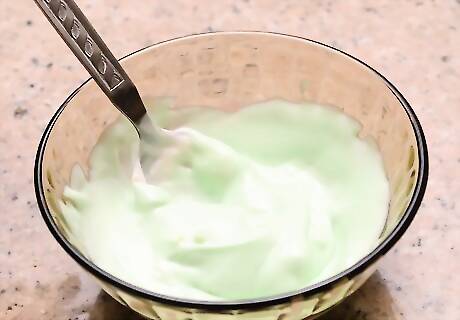 With a spoon, mix everything together. If you want to add the slightest bit of green food colouring, you can! But only a slight amount! Mix a bit more.