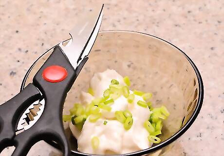 With the scissors, cut the chives over the bowl into tiny fragments. This may make your eyes water, so beware!!!!!!!