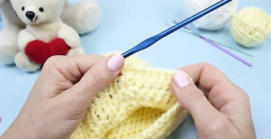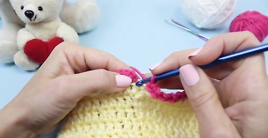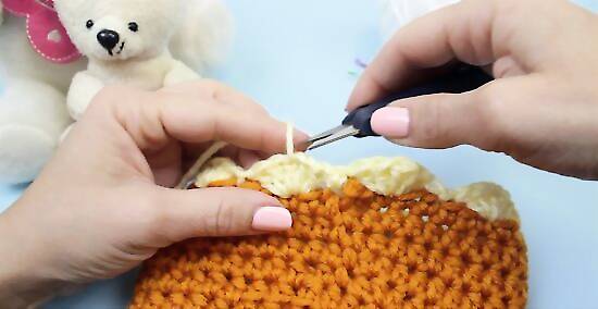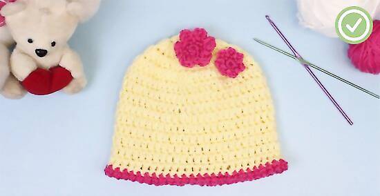Fasten off the end. Cut the yarn, leaving a 2-inch (5-cm) tail. Pull this tail through the loop on your hook and tighten to form a knot. Weave the ends into the stitches of your hat to hide them.