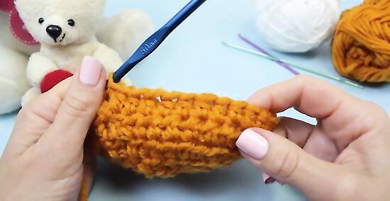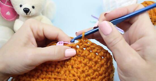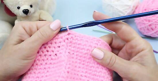 Turn and continue. Chain two, then flip your hat around. Continue making one double crochet in each stitch of the previous round as before, and conclude the round with a slip stitch. Rounds 15 and 16 are also made using this pattern, but you should not flip the hat around any more when making your rounds. Each of these three rounds should have 52 stitches.