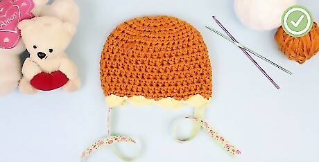 Tie on a ribbon. To complete the bonnet look, you need make two ribbon ties on the corners of the bonnet. Cut two lengths of ribbon, each measuring 20 inches (50 cm). Double one ribbon over and loop it through one of the front corners of the bonnet. Repeat with the other ribbon. The baby bonnet is now complete. Use these ties to secure the hat on your baby's head as needed.