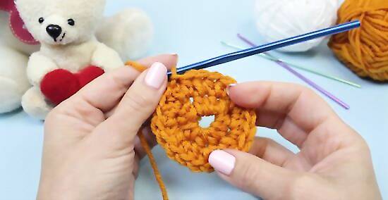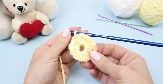 Double crochet into the middle of the ring for your first round. Make two chain stitches. Then, work 13 double crochets into the middle of the ring previously created. Slip stitch through both loops of the first double crochet to join the last and first stitches, completing the round in the process. Note that the first two chain stitches do not count as a stitch in this round.