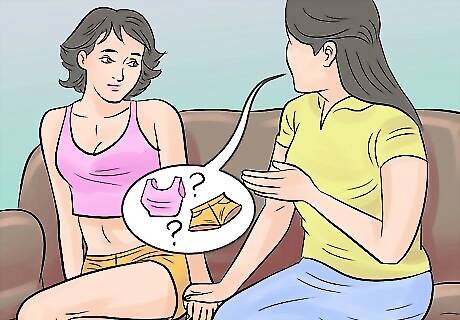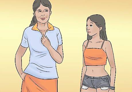 Give advice, not orders. Frame the conversation so you are giving them advice and not simply telling them what they can and cannot do. Avoid stating, “You are forbidden to wear this outfit” or “You are not allowed to wear that clothing.” Instead, go for phrases that sound suggestive and persuasive. For example, you may say, “I like that shirt but your jeans seems a little low, no? Maybe put on a belt to keep your pants up?” or “That’s a great dress, I just worry it may not be long enough for school. Maybe wear some tights with it?”