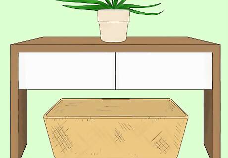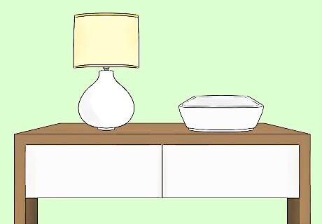 Place a tray or bowl on top of the table to collect keys and sunglasses. You’re likely always going to toss your keys onto the entry table so you might as well make a stylish spot to keep them. An acrylic tray, decorative bowl, or small woven basket are all good options. Be sure to pick something that can stand up to getting scuffed and scratched by keys. Small hooks next to the table will hold keys and purses if you don’t mind them being so visible. If you don’t like the look of keys, sunglasses, or chapstick on the table, choose a container that has a lid or that’s deep enough that you can’t easily see what’s inside.