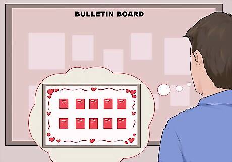 Know where you will be putting the decorations. Some decorations work better in some places than others do. For example, you can get away with using larger, brighter decorations in a classroom, but you might want to use smaller, less distracting decorations for your desk or cubicle. Make use of the bulletin board in classrooms. Use white or pink for the background, and red for the boarder. Decorate the board with the students' Valentine's day crafts. If you are in a cubicle, pin a heart or cupid cut-out to the wall. You can also place a glass bowl with candy hearts on your desk. If you work at a desk, try getting a Valentine's day themed figurine, such as a tinsel heart, and placing it on top of a lace doily. You can also place a jar filled with candy hearts on your desk. Decorate the windows with garlands and paper cut-outs if you own a shop. These will bring the holiday into your shop without getting in your customers' way. Go full out if you are decorating your home, but be mindful of people's private space. Consider decorating family areas, such as the kitchen, living room, and dining room.