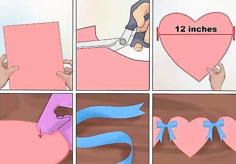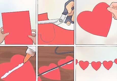 Make a simple garland. Find cardstock in red, pink, and white. Punch or cut hearts out of the cardstock. Arrange the hearts in a row, making sure to leave some space between each one. Draw a thin line of glue along the center of each heart, going from side to side. Cut a long piece of string, and place it across the hearts, right on top of the glue. For a romantic garland, fold lace, paper doilies over a piece of string. Secure the doilies with a drop of glue on the inside. To decorate for school or a book-lover, use photocopies of book pages instead.