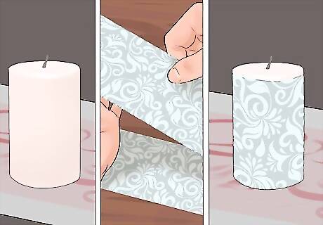 Add to existing pillar candles. If you can't find any red or pink candles, but don't want to use plain white candles, you can always dress up what you have. Wrap some twine or thick lace around the middle of a candle, and secure it with a piece of clear tape or a drop of glue. Stick a heart-shaped button or sticker in the middle. You can also wrap strips of double-sided tape around a candle, and then roll the candle around in glitter. Use Valentine's day colors, such as pink, red, gold, or silver. You can match the glitter to the candle color, or use a contrasting color, such as gold glitter on a red candle.