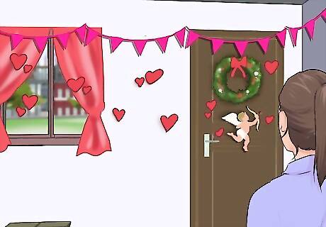 Make use of store-bought decorations. They usually start appearing in stores around January. Party supply stores and arts and crafts stores often have a lot to choose from. Some department stores may also sell them. Here is a list of store-bought decorations, and how you can use them: Drape banners across doorways, fireplace mantles, and windows. Pin or tape cupid and heart cut-outs on doors, above fireplace mantles, and on windows. Hang wreaths on doors or above fireplace mantles. Place tissue balls and flower balls in glass bowls. If they come with a ribbon or string loop, you can hang them up instead. Place figurines, miniature plants, and tiny topiaries on mantles and desks.