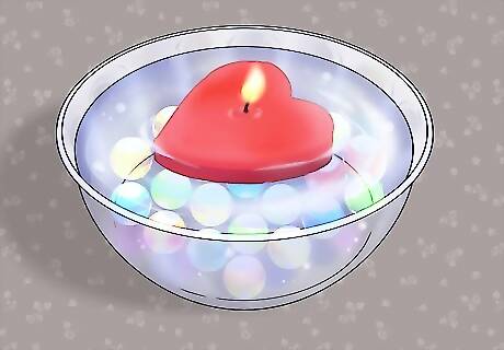 Use floating candles for a more romantic look. Fill a shallow, glass bowl with water, and add some floating candles. For some more color, scatter some red or pink glass marbles across the bottom of the bowl. You can use ordinary white floating candles or rose-shaped ones (in red, pink, white, gold, or silver). For a twist on the floating candle, consider using a tall, cylindrical vase or a mason jar instead of a glass bowl. Fill the vase or jar almost to the top with water, and add the candle.