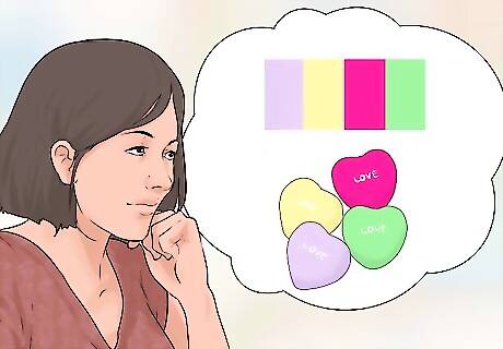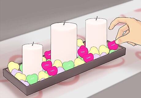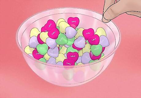 Place bowls of candy throughout the house or room. For a fancier twist, place the candy in a fake crystal bowl or on a cupcake tray. Conversation hearts and cinnamon hearts are perfect for Valentine's Day. If you don't like those candies, however, try chocolates, or other red-colored candies.