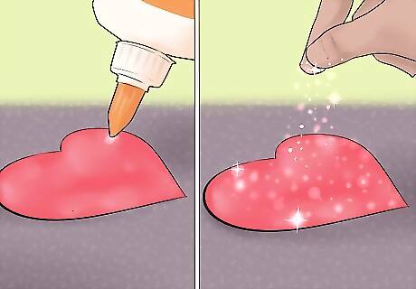 Add some sparkle to just about anything with glitter. Apply some white glue onto the area you want glittery. If you want to use more than one color, start with your first color; you will apply the other colors later. Shake the glitter onto the glue, then tap the excess off. If you want to add more colors, apply the glue for your next color. You can apply glitter to just about anything, including candles, jars, and cards. Use Valentine's day colors, such as red, pink, and iridescent, when coloring large areas. Use gold and silver for small, accent areas. For large areas, use loose glitter and glue. You can use spray-on glue, or liquid glue. Use a paintbrush or foam brush to apply the liquid glue. Use double-sided tape on boarders. Place the tape down first, then shake some glitter over it. Use glitter glue pens for fine, detailed areas. Glitter glue pens will also work for letters.