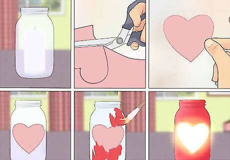 Make some Valentine's Day candle holders using mason jars, paint, and glitter. Cut a large heart out of adhesive paper, and stick it onto the side of the jar. Paint over the jar using Mod Podge. Shake on some white, pink, or red glitter, and then peel off the heart. You will be left with a heart-shaped hole; the candle light will shine through this hole. Wait for the glue to dry, then tie a pretty pink ribbon around the mouth of the jar. Wipe the entire jar down with rubbing alcohol first. It will help the glitter stick better. Consider painting the jar first. Match the color of the paint to the glitter you will use. Try to use fine, scrapbooking glitter instead of thick, chunky glitter. It will look more professional.