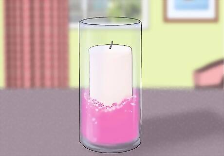 Fill a cylindrical or hurricane vase with pink and/or white sand and stick a pillar candle on top. You can also use other vase fillers as well, such as conversation hearts or glass marbles in pink, red, or clear. Try to use a contrasting color for the candle, so if you are using pink filler, use a white candle. For a finishing touch, wrap some pink or red ribbon around the middle of the vase, and tie it in a bow. To use less filler: place a small can inside the vase, and stick the candle on top. Fill the space around the can with filler, all the way up to the top of the can. When you are done, the can should not be visible.