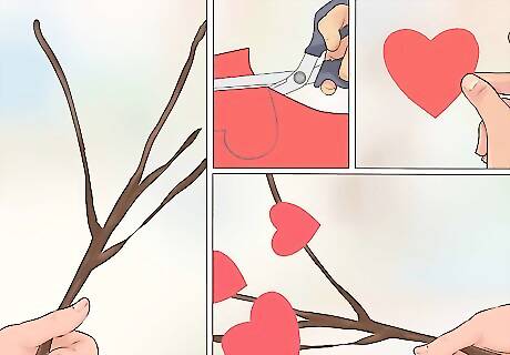 Make a heart tree using tree branches and hearts. Go outside and find a tree branch; it should be no longer than your arm, with thin, delicate twigs. Cut some hearts out of pink, white, and/or red paper. Glue the hearts onto the twigs using hot glue. Stick the branch into a vase. Try using pearly scrapbook paper or glitter paper. It will look more romantic.