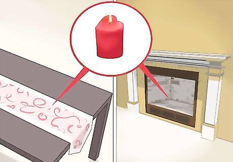 Put candles on tables and fireplace mantles. If you are using pillar candles, use both short and tall ones. This will make your mantle look more interesting. Also, try to use a color that contrasts with the mantle, or the wall behind it. For example, if you have a dark-colored mantle, use white or ivory candles. If you have a white mantle, use pink candles for a softer look, or red candles for a romantic look. Red, pink, and white/ivory are typical Valentine's day colors. You can also use gold or silver.