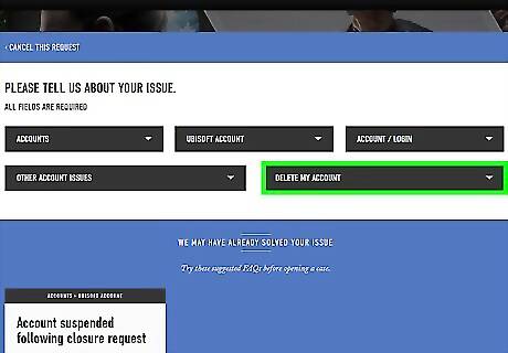 Choose the appropriate drop-downs. These fields will get the email to the correct customer service agent that can help you. Choose Accounts > Ubisoft Account > Account/Login > Other Account Issues > Delete My Account.