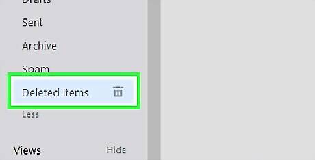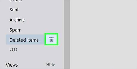 Select the Deleted Items folder. Placing your mouse cursor on this tab on the left side of the inbox will prompt a trash icon to appear next to it.