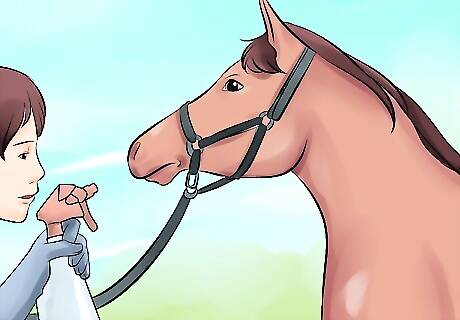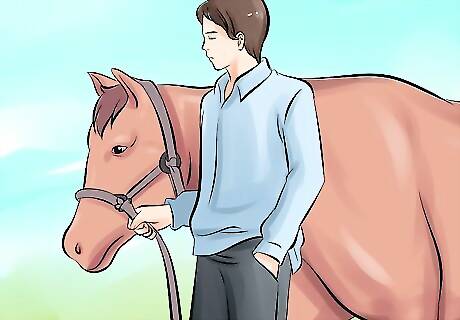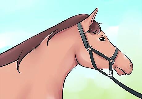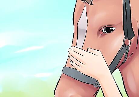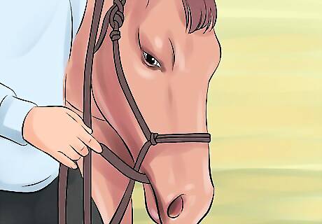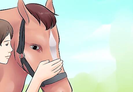 Read the horse's body language. At this point, the horse's head should raise into an alert position, and it may try to shy away. If at any point, the horse shows signs of more violent behavior, such as aggressive rearing or kicking, taking the horse to a professional horse trainer is highly recommended.