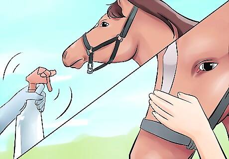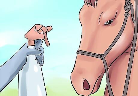 Display the object that scares the horse. The goal of desensitization training is to gradually ramp up the level of "pressure" on the horse, waiting until it is comfortable with each stage before moving upward. Start by simply showing the horse the object that spooks it, without using it to make noise or moving it around. Keep the pressure low at first by holding the object below the level of the horse's head. If the horse is afraid of an experience, such as being given a bath, choose an object that is related, such as a hose or spray bottle. If the horse is afraid of a large object, such as a horse trailer, lead it near the object, but allow it to stop a short distance away.