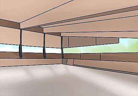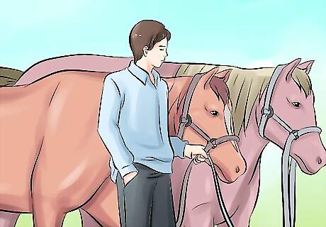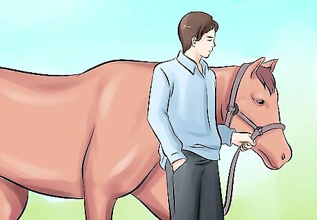 Stand to one side of the horse. Horses are most easily spooked from the front or the back. Stand a short distance away from the horse's side, near the front so the horse can see you. Begin at least five feet (1.5 meters) away when starting training. For small horses and ponies, you may stoop down to their level to calm the horse further. Do not do this if there is any risk of the horse kicking you.