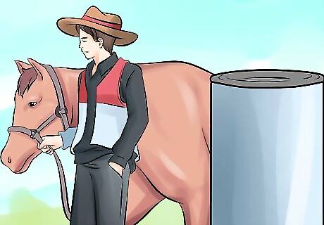 Keep your voice and body language calm and controlled. Horses can pick up on your stress or anger, and this can spook them further. Relax and lower your shoulders, and keep your movements relaxed and controlled. Speak calmly but authoritatively. Do not shout or use an angry tone of voice. If you are trying to desensitize the horse to loud voices, have an assistant stand nearby and talk loudly. As the trainer, you need to remain calm and reassuring, to show the horse that nothing harmful is happening.