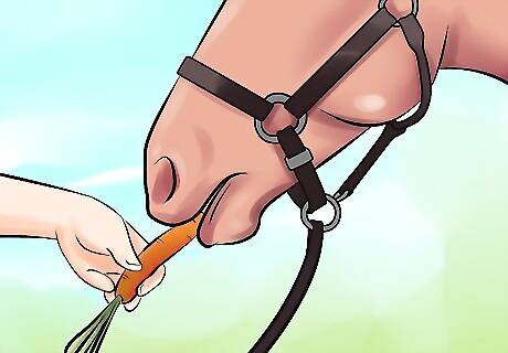Give the horse a couple minutes to calm down. Continue to display the object, speaking calmly and reassuringly, until the horse lowers its head, takes a deep breath, or begins working its jaws. These are signs that the horse has calmed down, and may recognize that the object is not a threat. Praise the horse to reward this behavior.