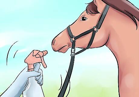Continue this training once or twice a day. A maximum of two short training sessions is recommended. Begin with simply displaying the object each time, until the horse calms down. Continue to gradually increase the pressure on the horse, making louder noises with the object or waving it around more aggressively. Praise the horse each time it calms down, and give it a special treat at the end of the training session. Once the horse remains calm around the object, try the same process again while the horse is walking. Some horses are more easily spooked while moving. The final stage of desensitization is often the placement of the object on the horse's body. Start at the back and side, then gradually increase the pressure over several training sessions by moving to the legs, hindquarters, feet, neck, and face.