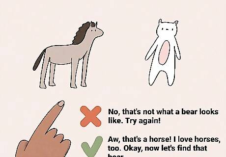 Negative language can feel discouraging for your child. You might be surprised by how often negative language slips into our speech! You can’t completely avoid negative phrases in all situations, of course, but try to stick with positive phrasing as much as you can. The more positive your language is, the more validated and encouraged your child will feel. For example, if your child is coloring, avoid saying things like, “The sky isn’t pink. Can you tell me what color the sky really is?" Since creativity is a form of communication, your child might feel scolded or judged. Instead, you might say, “I love that pink sky—you're so creative! Do you like the pink sky more than our blue sky?” If you ask your toddler to point to the bear in a picture and they point to a horse, don't say, "No, that's not what a bear looks like. Try again!" Instead, say something like, "Aw, that's a horse! I love horses, too. They can run so fast! Okay, now let's find that bear..." This mostly applies to toddlers and young children since babies can't tell the difference between positive and negative words yet.